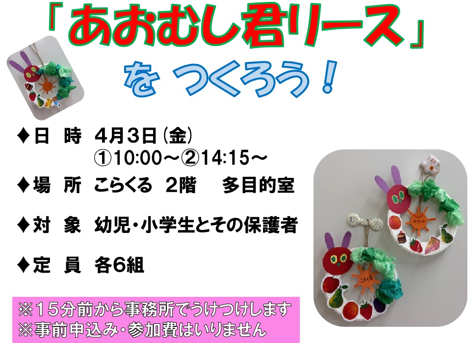 ※ おはなしカフェinこらくる~おむすびころりん~ 申込みは2月1日(日)9:00からです。しばらくおまちください。・・・