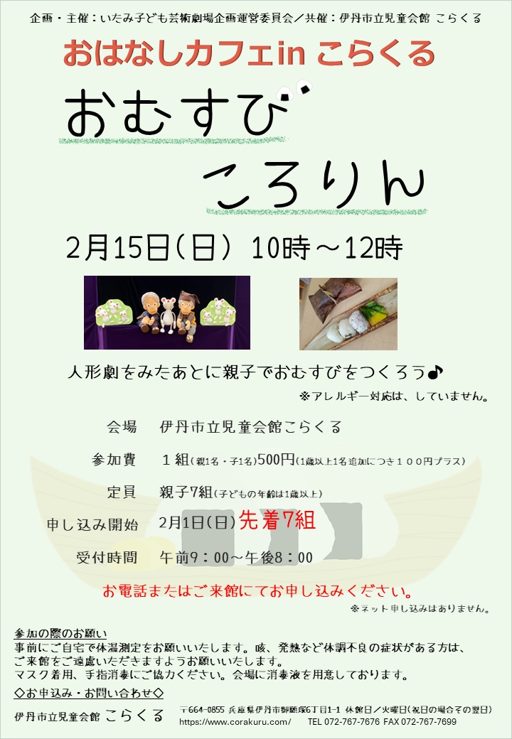 ※ おはなしカフェinこらくる~おむすびころりん~ 申込みは2月1日(日)9:00からです。しばらくおまちください。・・・