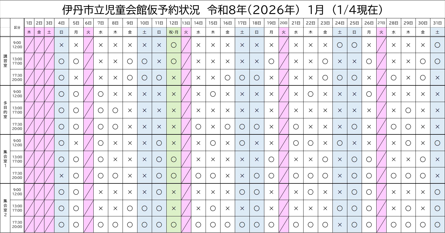 ※ 2026年1月4日現在の予約状況です。 ホームページの更新は、リアルタイムではございません。 予めご了承ください。 次回の更新は、1月15日を予定しています。・・・