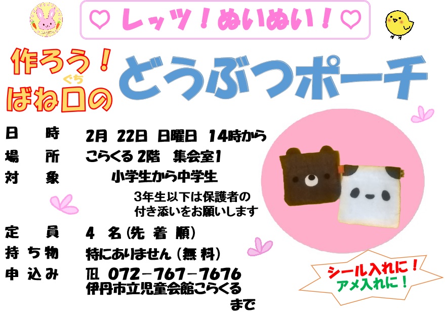 2月22日(日)開催「レッツぬいぬい!どうぶつポーチ」