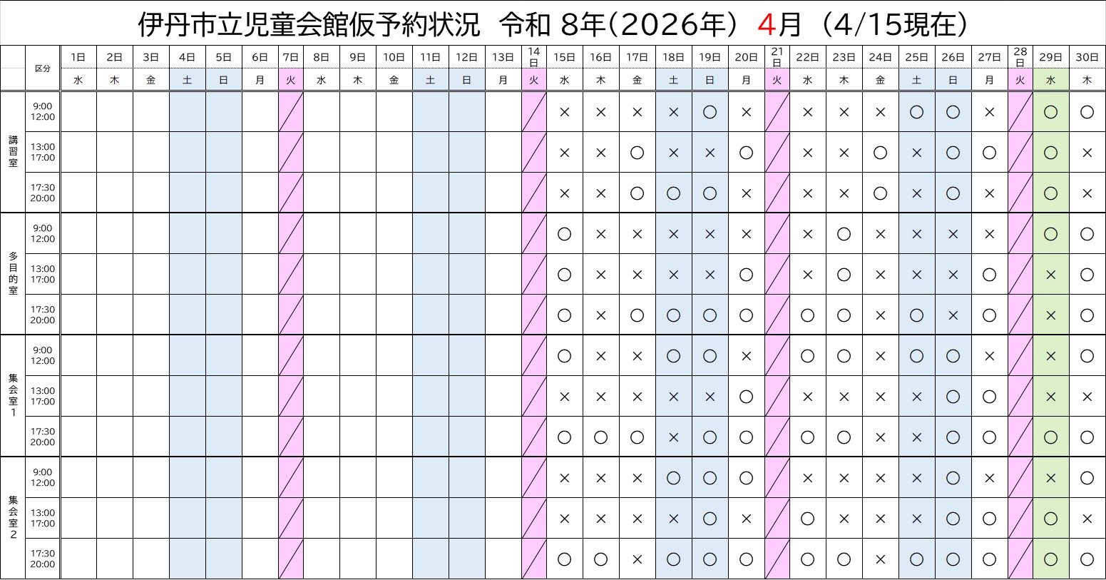 ※ 2026年4月15日現在の予約状況です。 ホームページの更新は、リアルタイムではございません。 予めご了承ください。 次回の更新は、5月1日を予定しています。・・・