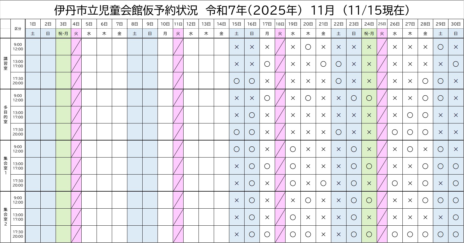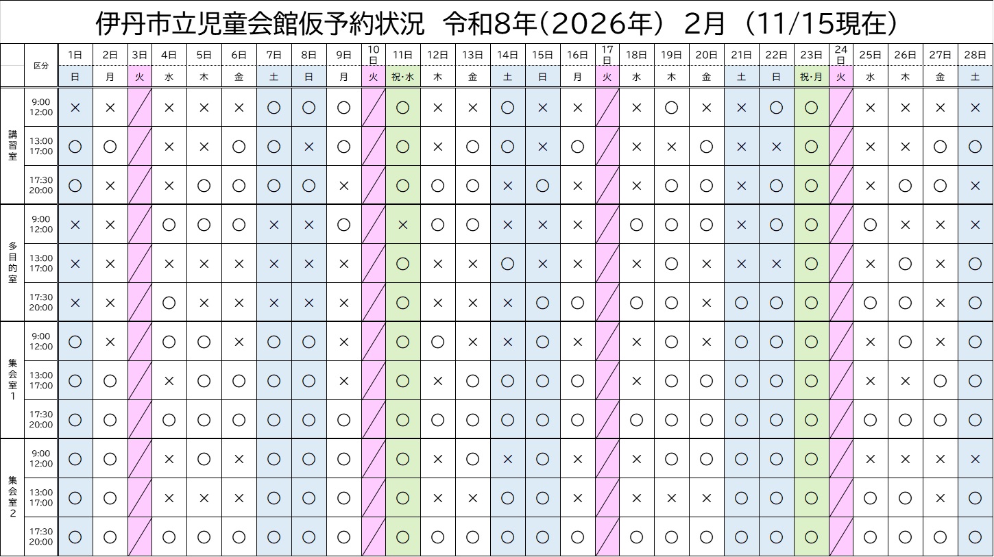 令和7年11月、12月、令和8年1月、2月部屋予約状況