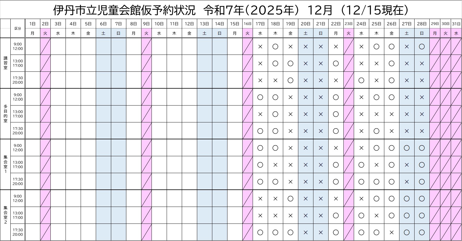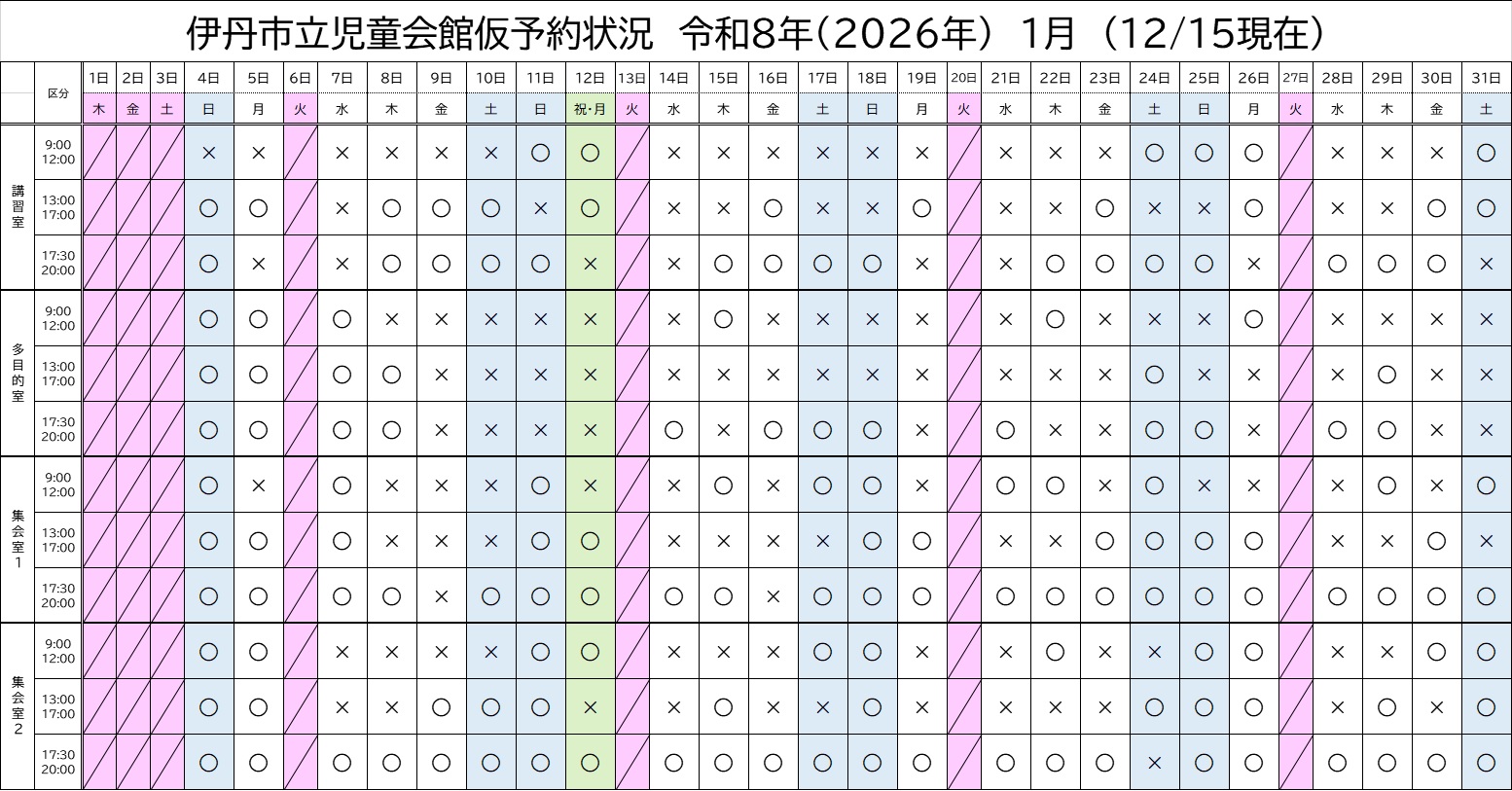 令和7年12月、令和8年1月、2月、3月部屋予約状況 ※ 2025年12月15日現在の予約状況です。 ホームページの更新は、リアルタイムではございません。 予めご了承ください。 次回の更新は、1月4日を予定しています。