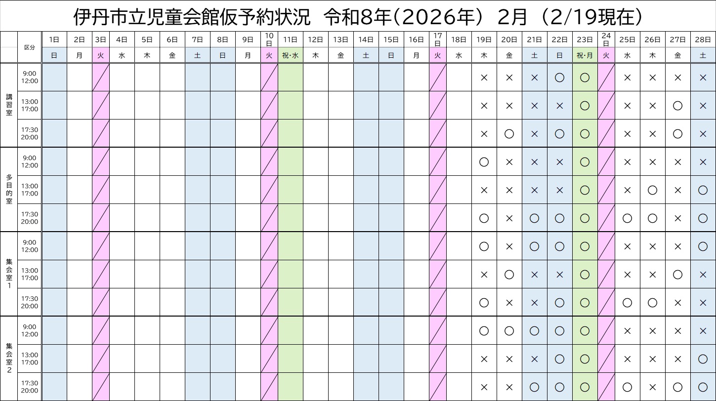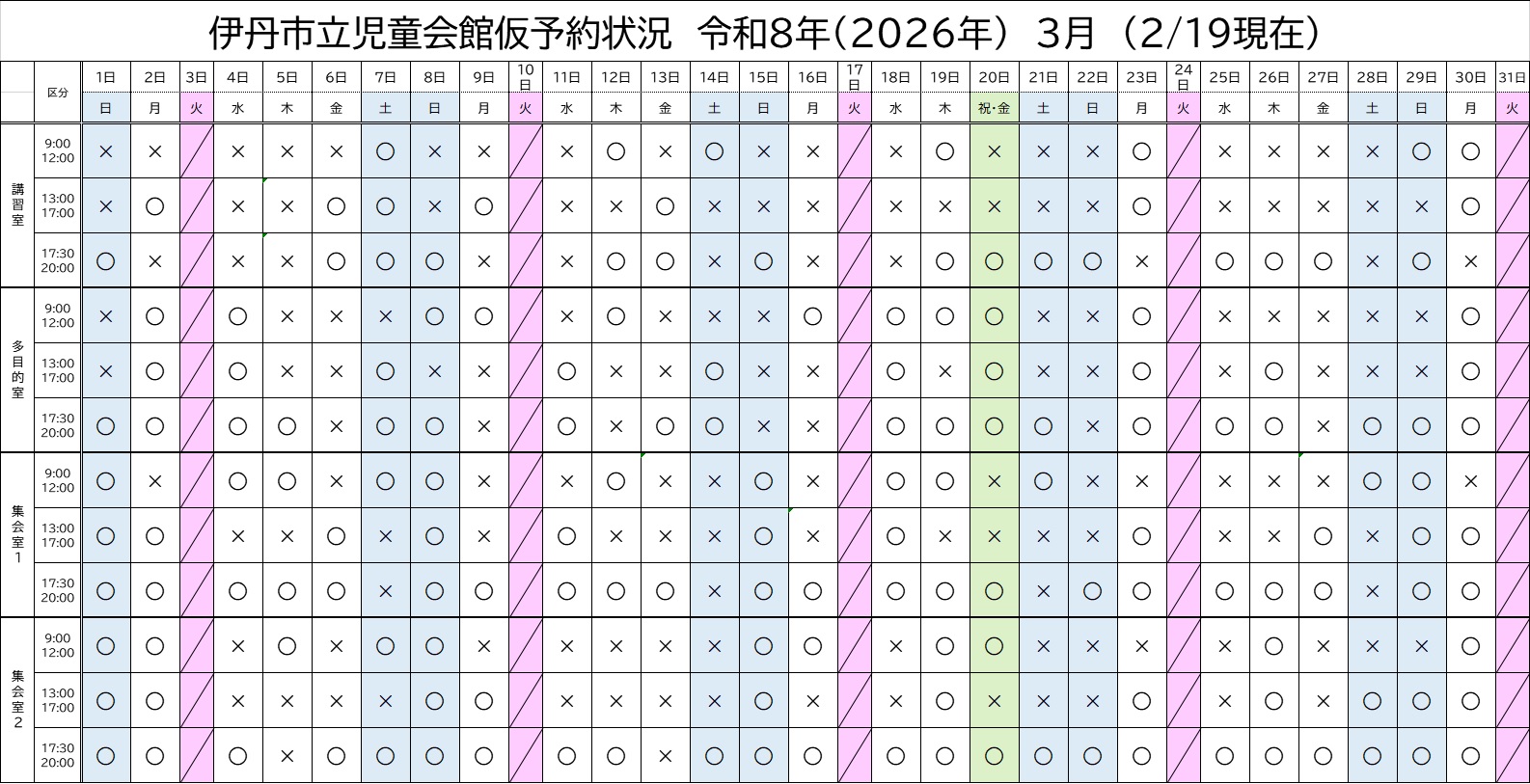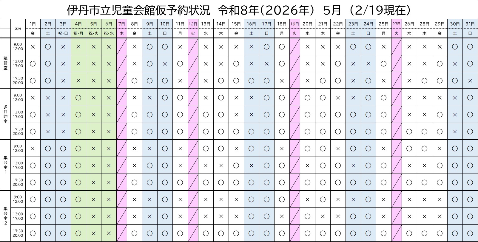 令和8年2月、3月、4月、5月部屋予約状況 ※ 2026年2月19日現在の予約状況です。 ホームページの更新は、リアルタイムではございません。 予めご了承ください。 次回の更新は、3月1日を予定しています。