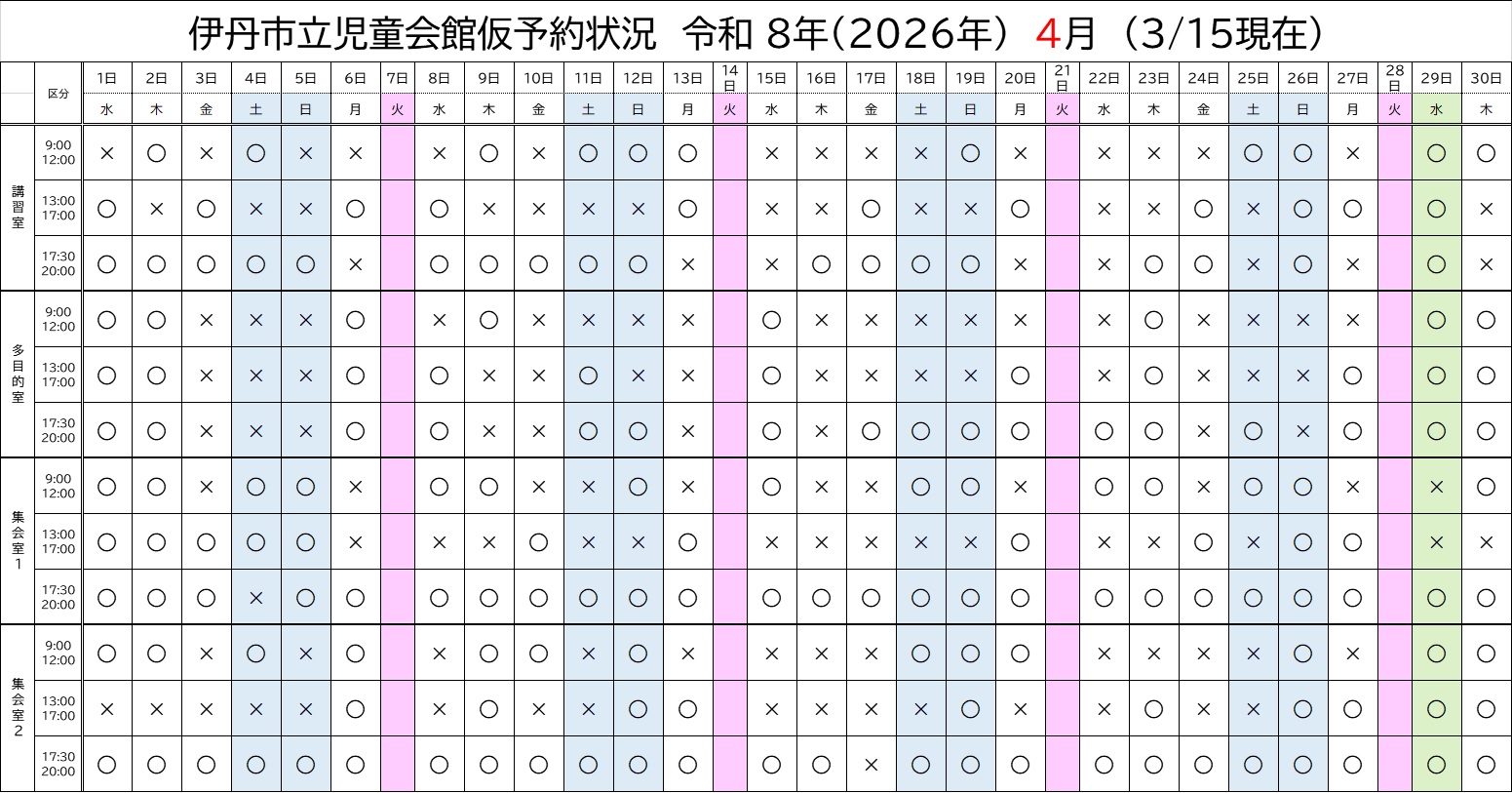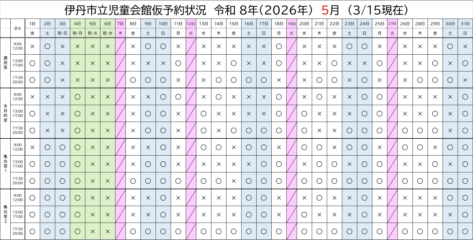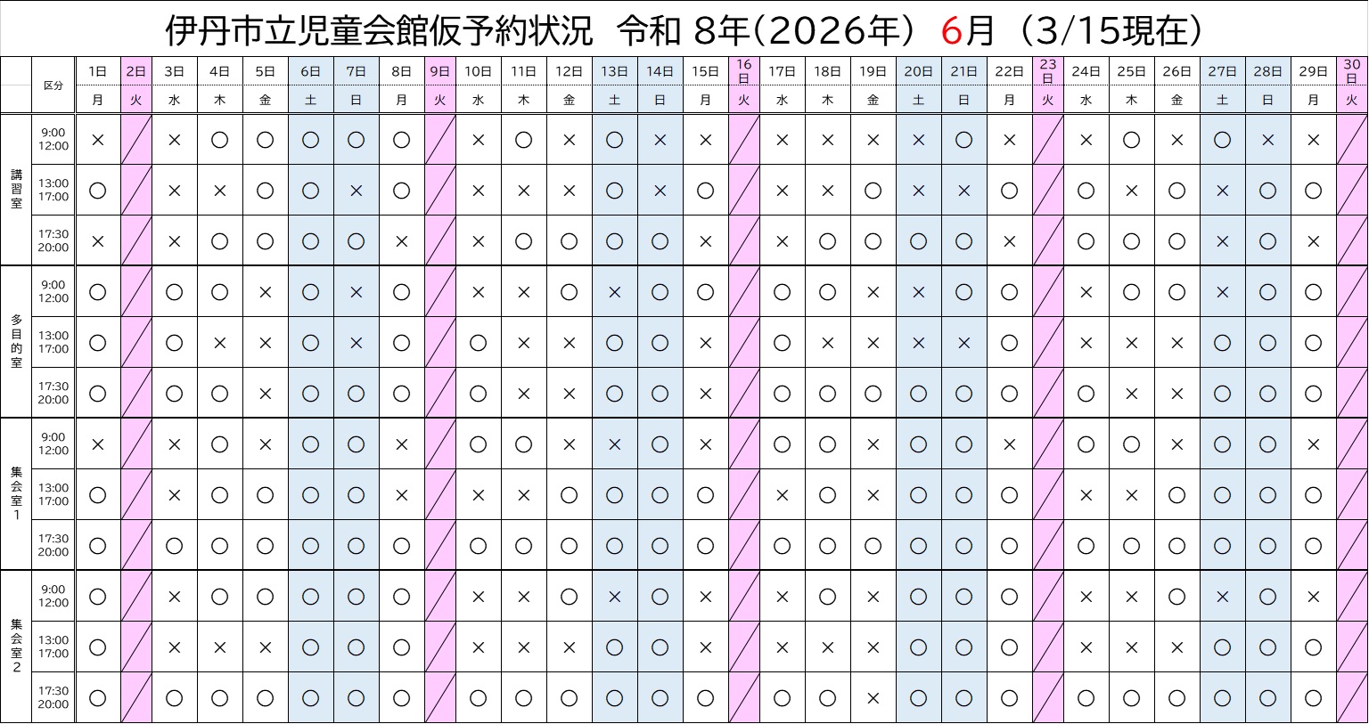 令和8年3月、4月、5月、6月部屋予約状況